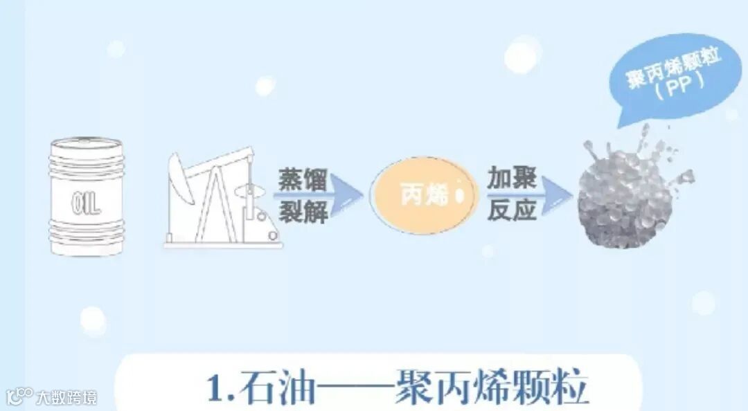 石油经过蒸馏裂解得到丙烯,丙烯加聚反应形成的聚合物就是聚丙烯(PP)颗粒。