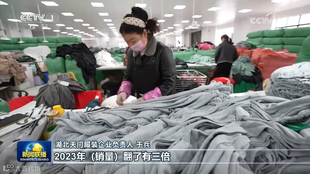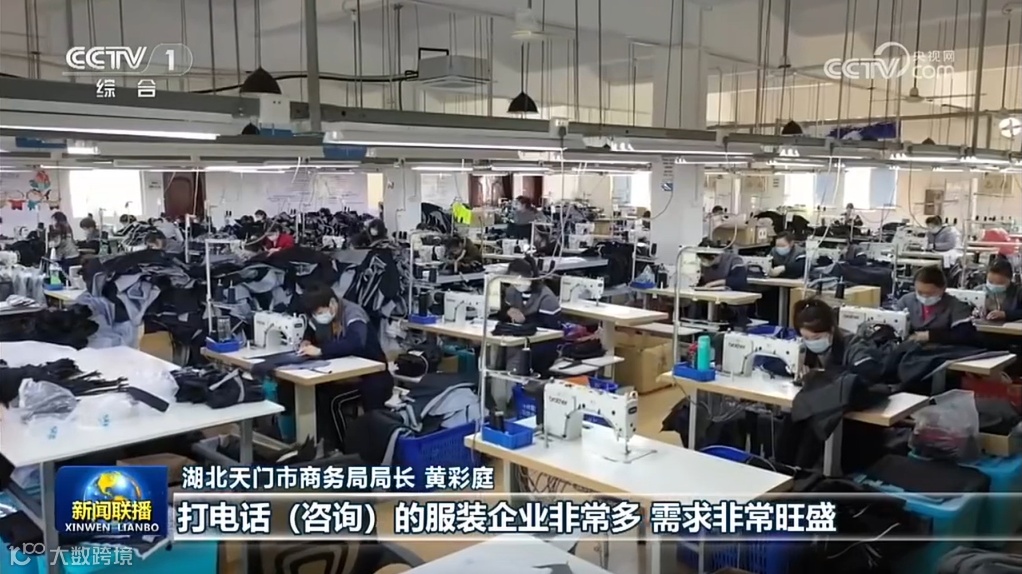 央视记者随机走访其中一家服装厂湖北天门服装厂采访时,工人们正在热火朝天地赶制新一批即将发往海外的订单,据得知该工厂开设不到两年为因对跨境电商这波”泼天的富贵“,扩大生产力,已开设了 25 个分厂,其中有 17 个分厂投产使用,每天产量高达 7000 件,还是不能满足眼下订单出货量。