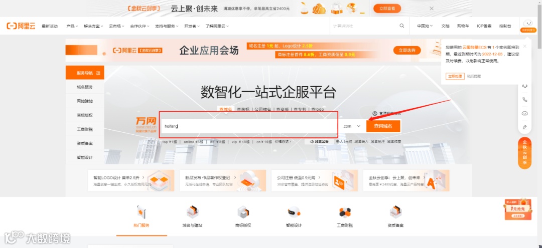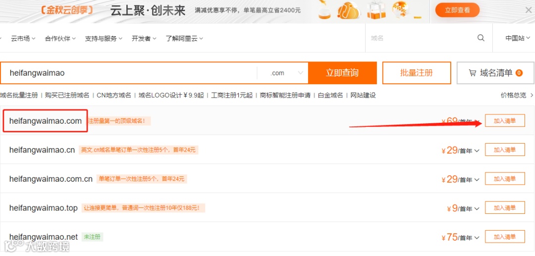 输入想要的域名,查询能否购买,默认后缀就选择com