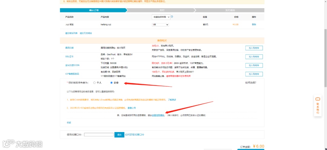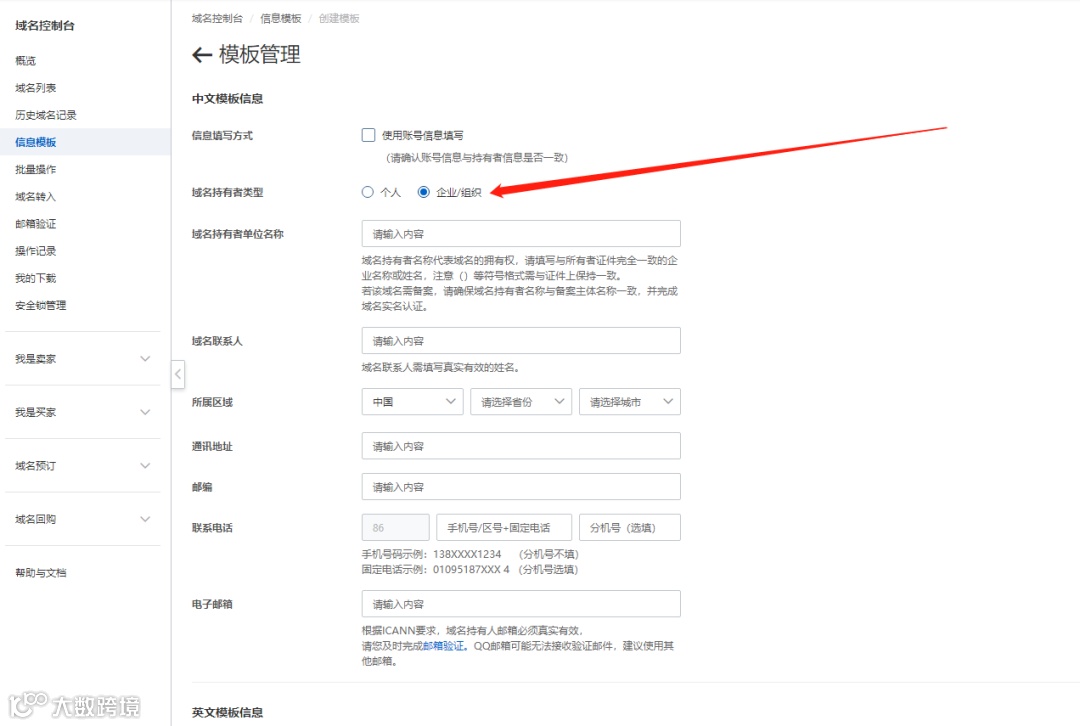 域名持有者选择企业,创建信息模板,依照要求填写信息。