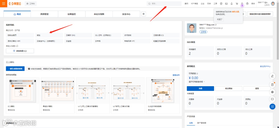 完成支付后不知道哪里查看域名的,点击首页——最右边控制台——域名,即可查看已购买的域名,找不到可以中间搜索框内搜索“域名”