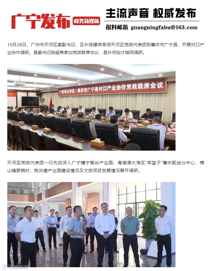10月下旬,天河区党政代表团到广宁县开展对口产业协作调研并视察阳光科密产业园,广宁政务新媒体“广宁发布”跟进报道。