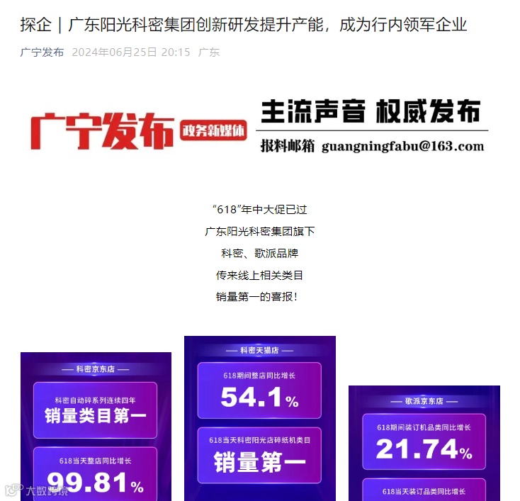 广宁政务新媒体“广宁发布”公众号中的阳光科密报道: