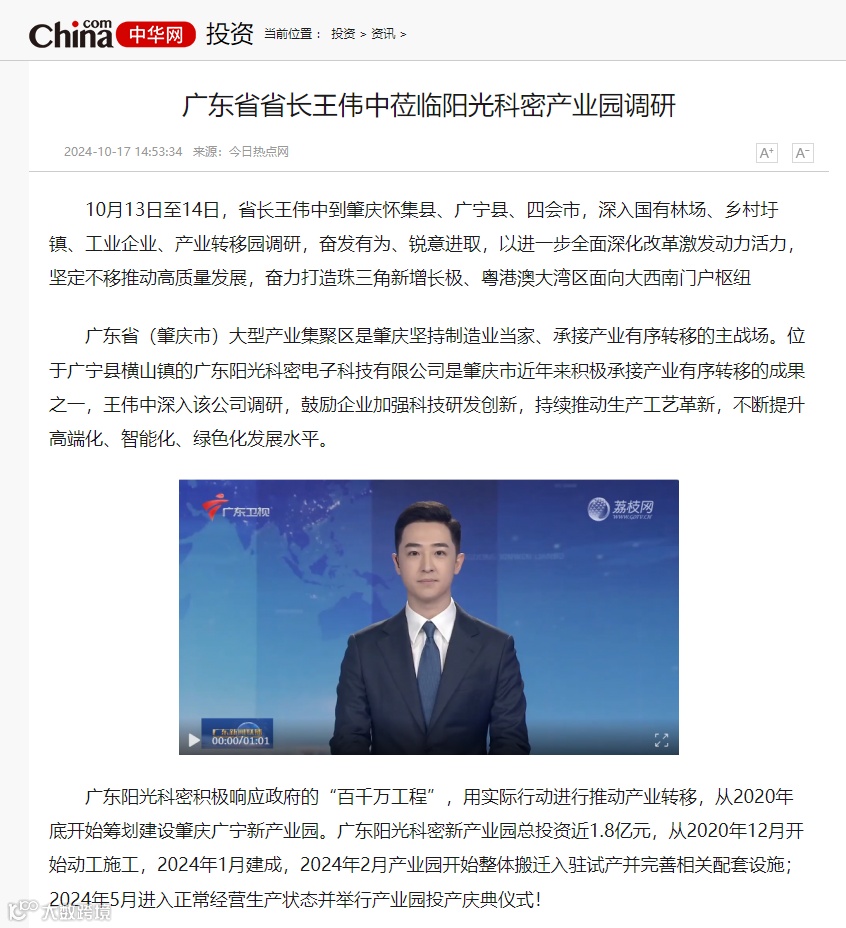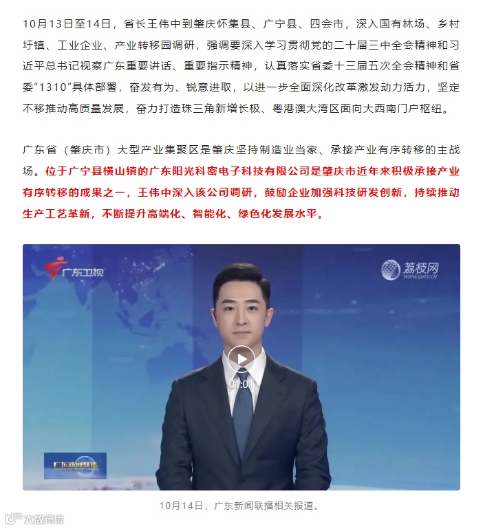 10月中旬,广东省省长王伟中莅临阳光科密广宁产业园调研,央视二套及广东省人民政府门户网站、广东省新闻联播发布相关视频、文字报道。