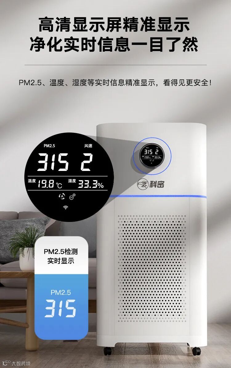 科密空气净化器的机身配备高清显示屏幕,实时精准显示PM2.5、风速等数据信息。净化效果更直观,更安心!