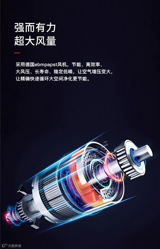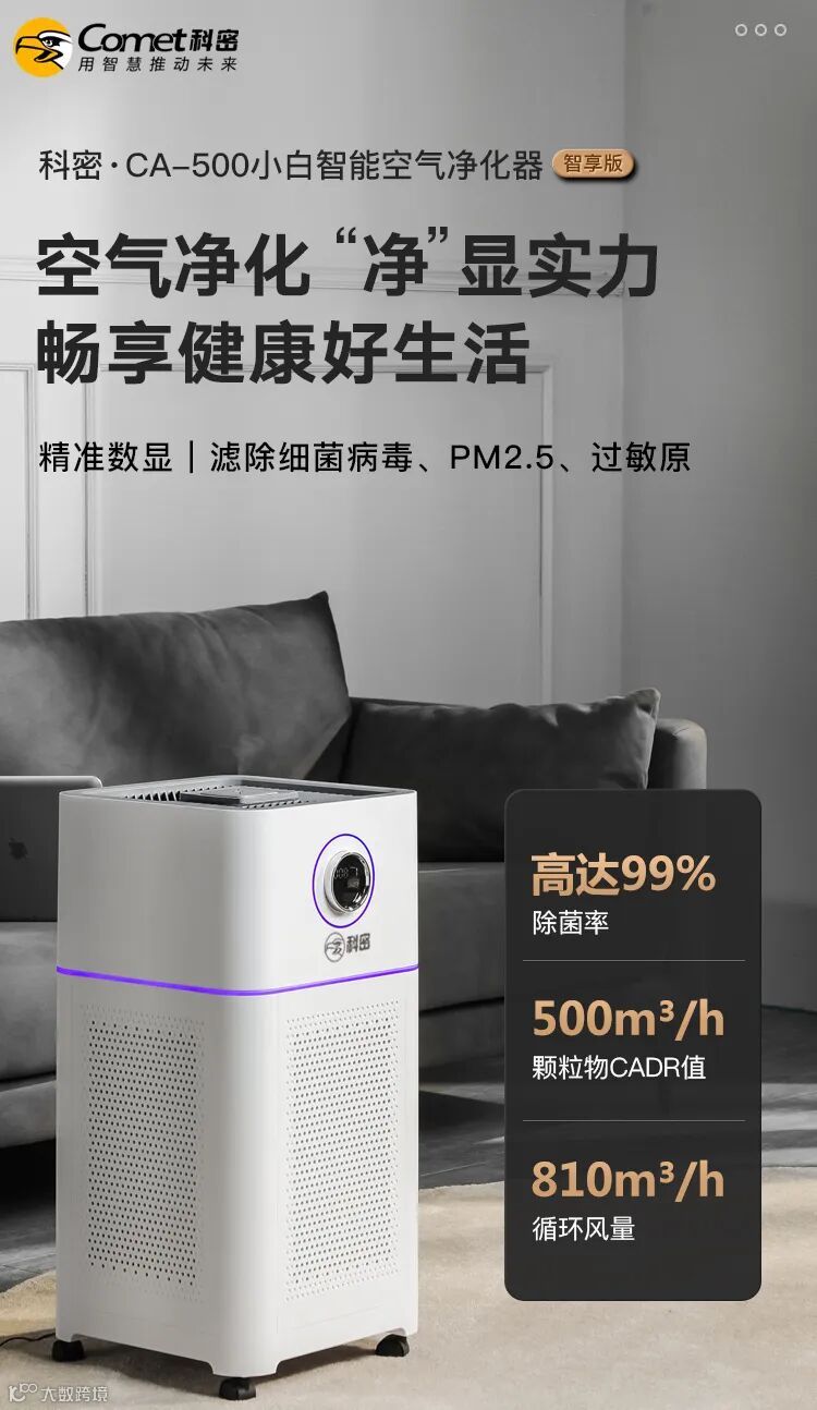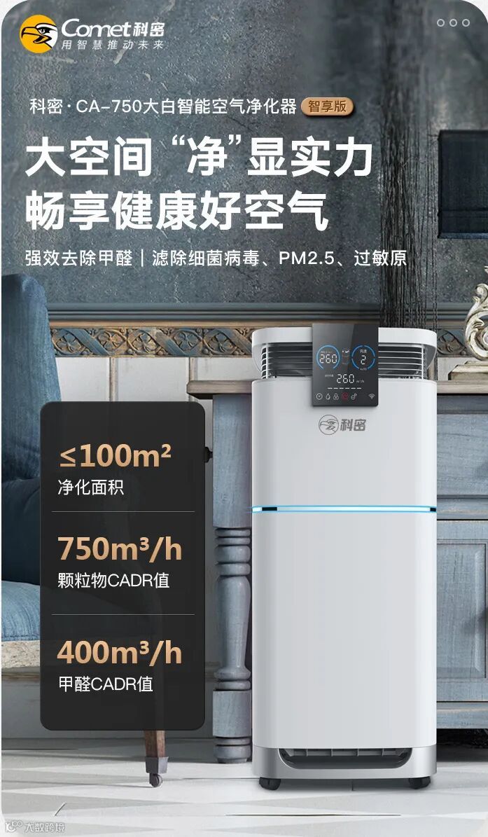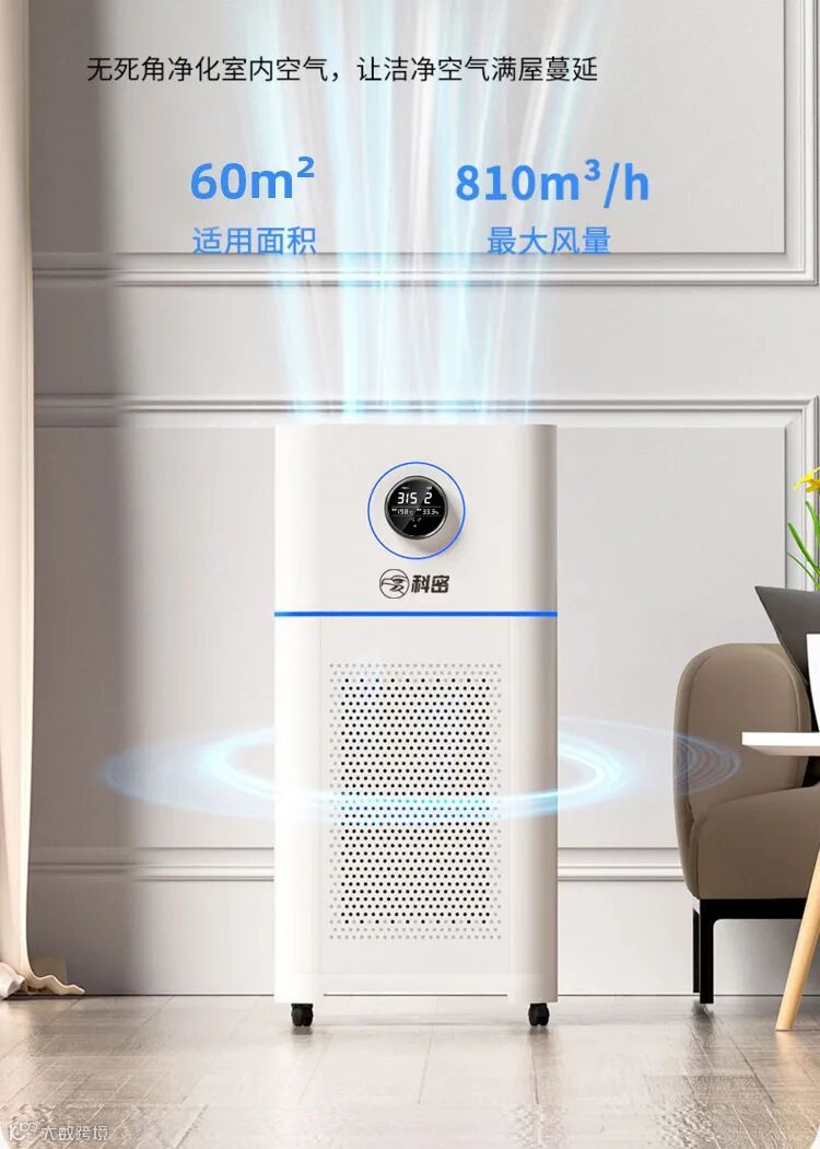 科密CA-750空气净化器适用面积可达100m³,搭配德国ebmpapst风机,10分钟高效净化全屋空气,适合办公区域、大户型房屋等大空间使用。