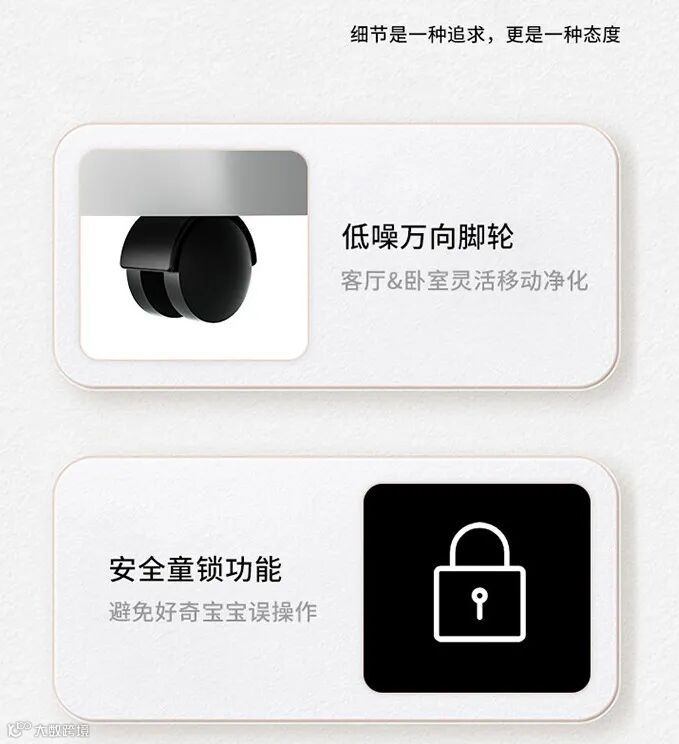 科密空气净化器不仅拥有过硬的净化能力,更有低噪万向轮、童锁功能、滤网更换提示、盖板开盖断电等贴心细节设置。方便机器移动,防止孩童误触,更安全,更舒心。