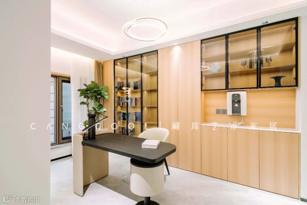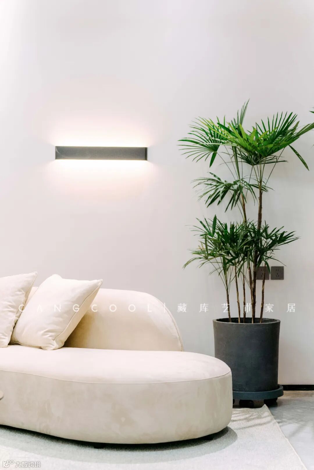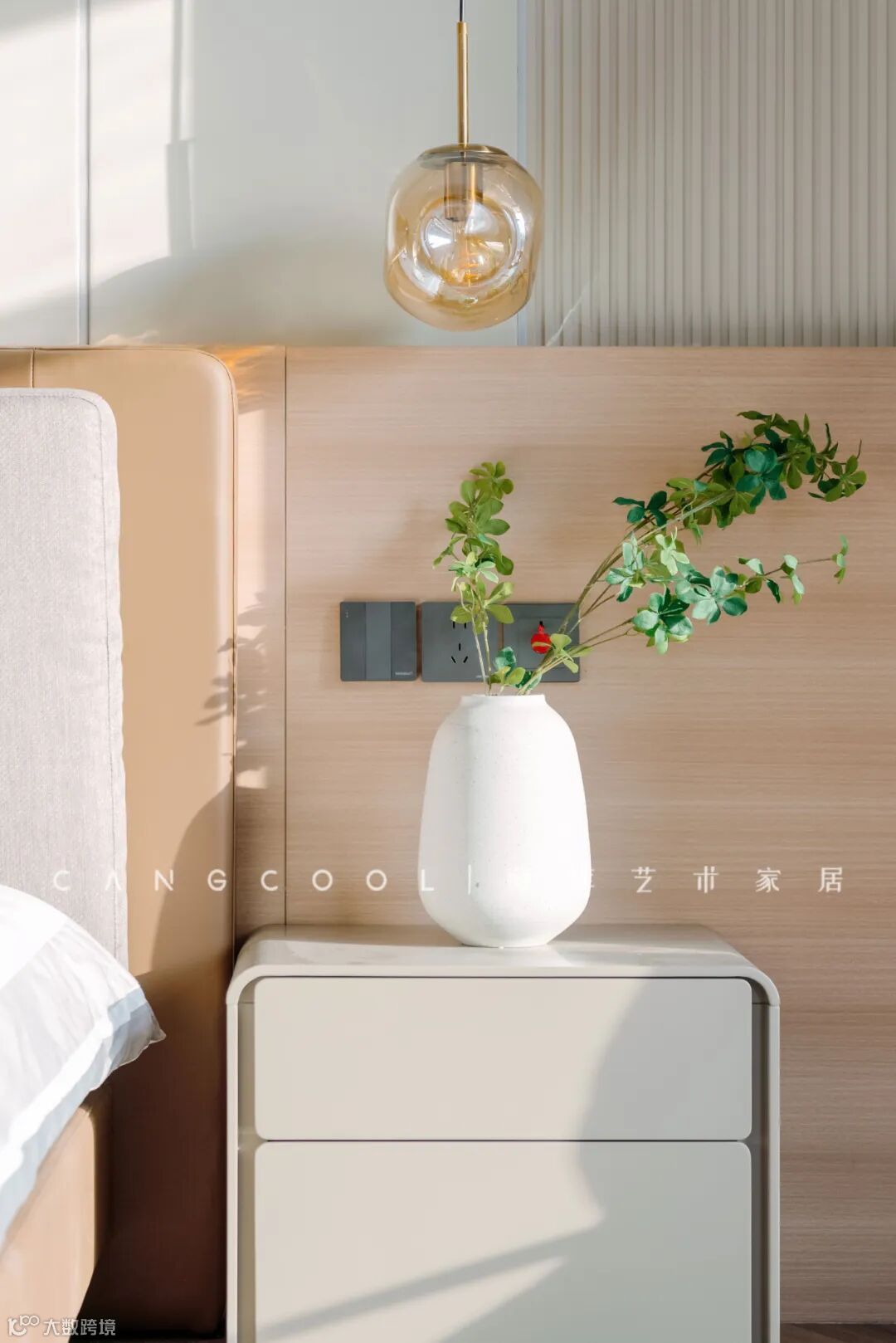 我们步入卧室,浅米色作为空间的主色调,直线曲线勾勒框架,奠定了空间的理性和克制。藏库设计师将展示与休息的空间感,拿捏得恰到好处。