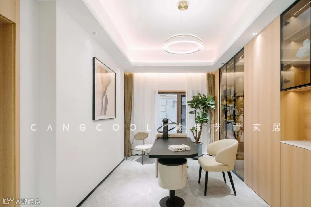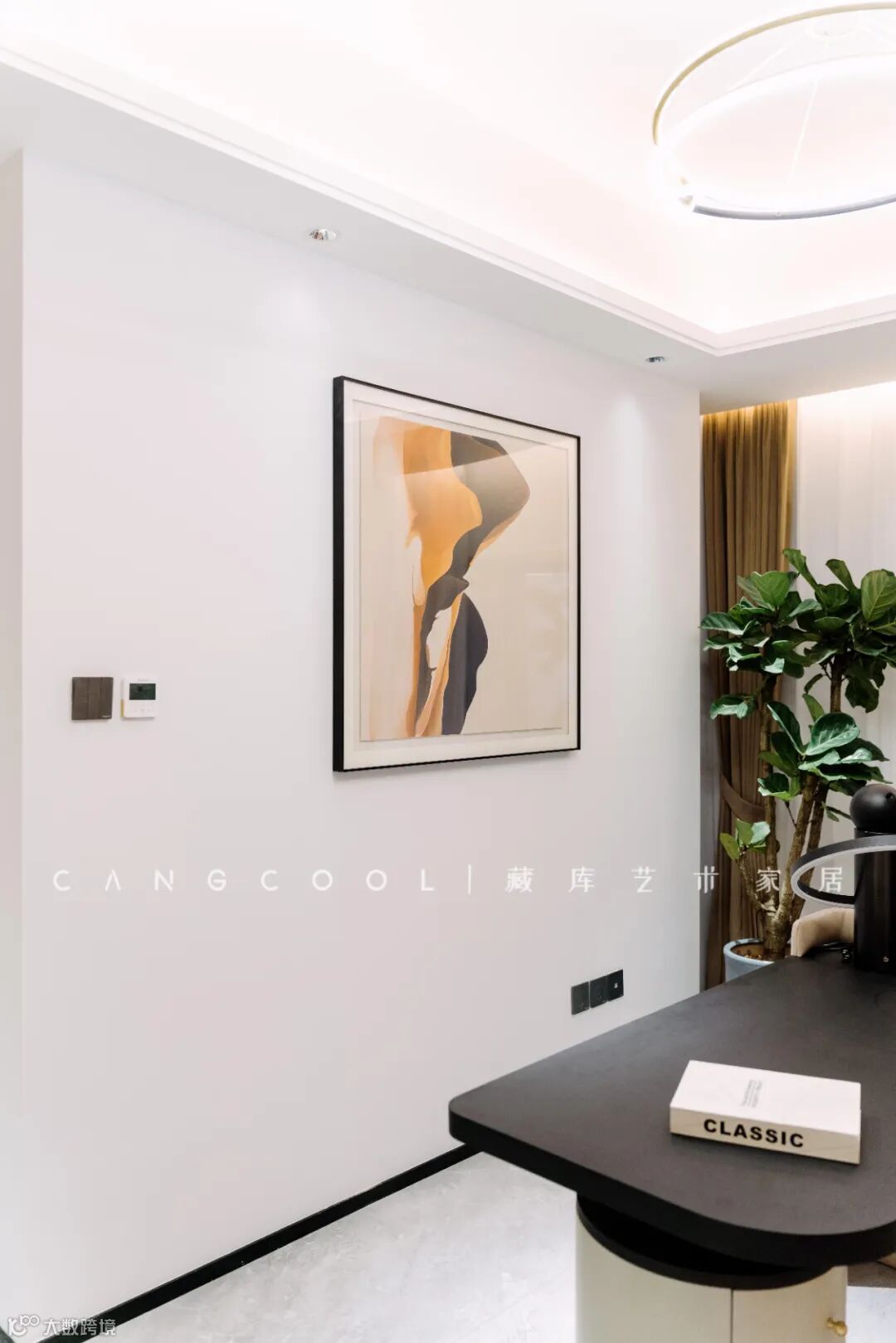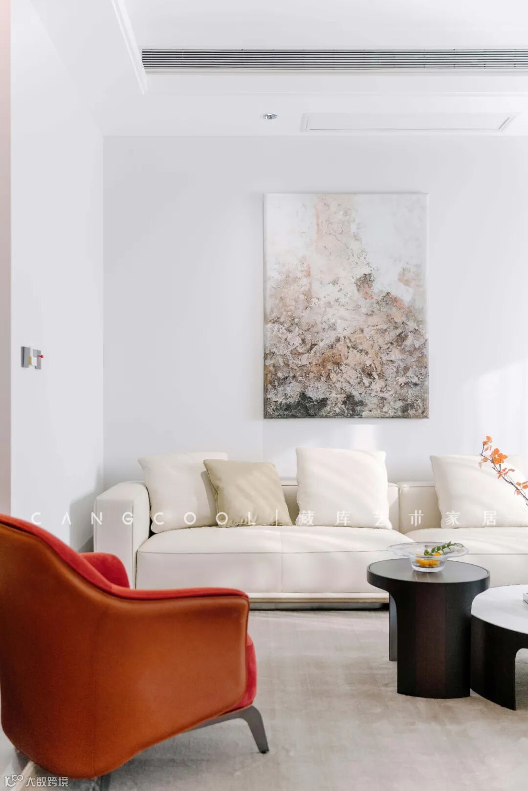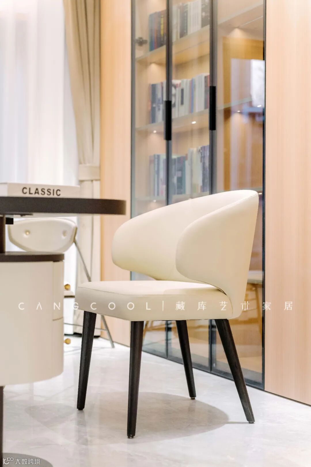 我们步入卧室,浅米色作为空间的主色调,直线曲线勾勒框架,奠定了空间的理性和克制。藏库设计师将展示与休息的空间感,拿捏得恰到好处。