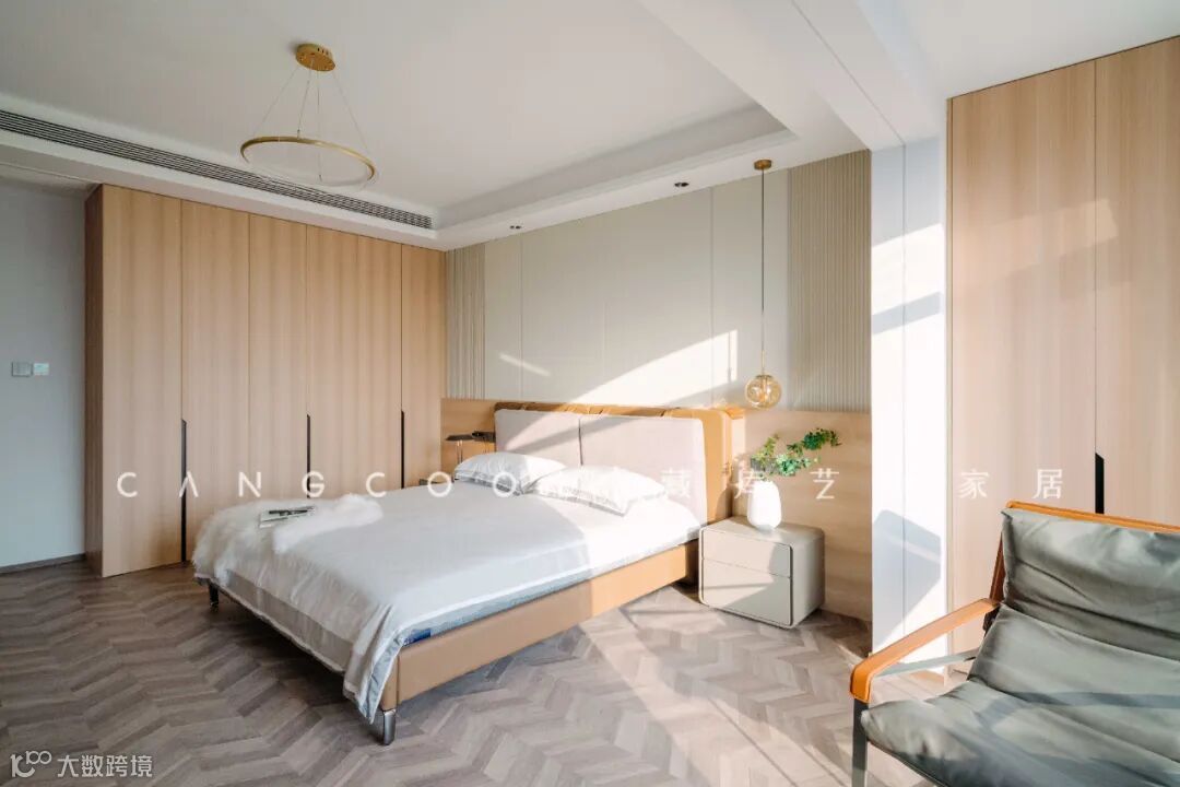 深沉的木面、轻柔的布面,深与浅的交织延申至主卧空间,灯光的明暗调子分布在需要的每一个地方。优雅而浪漫,让人感知空间带给人的美好。