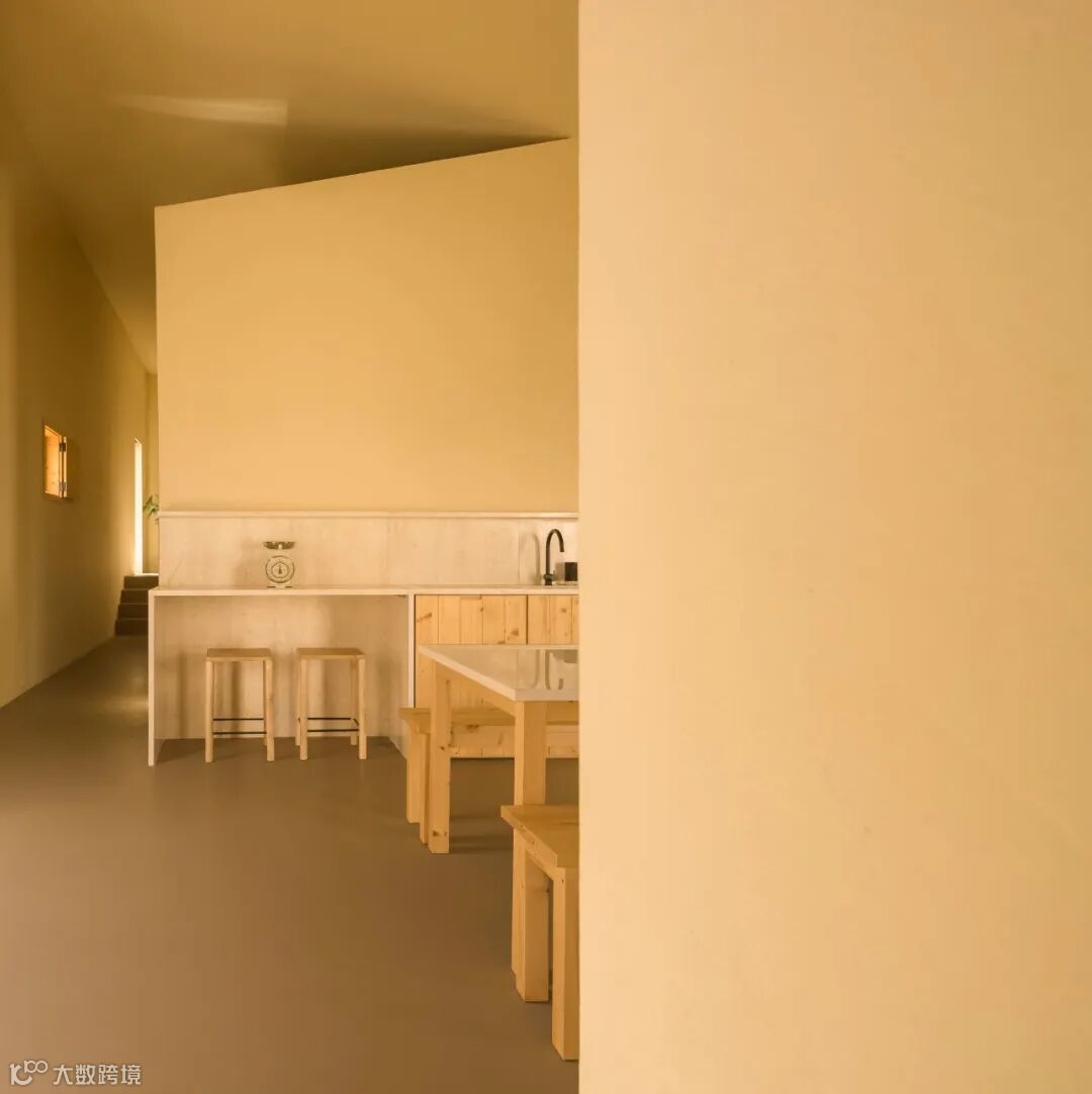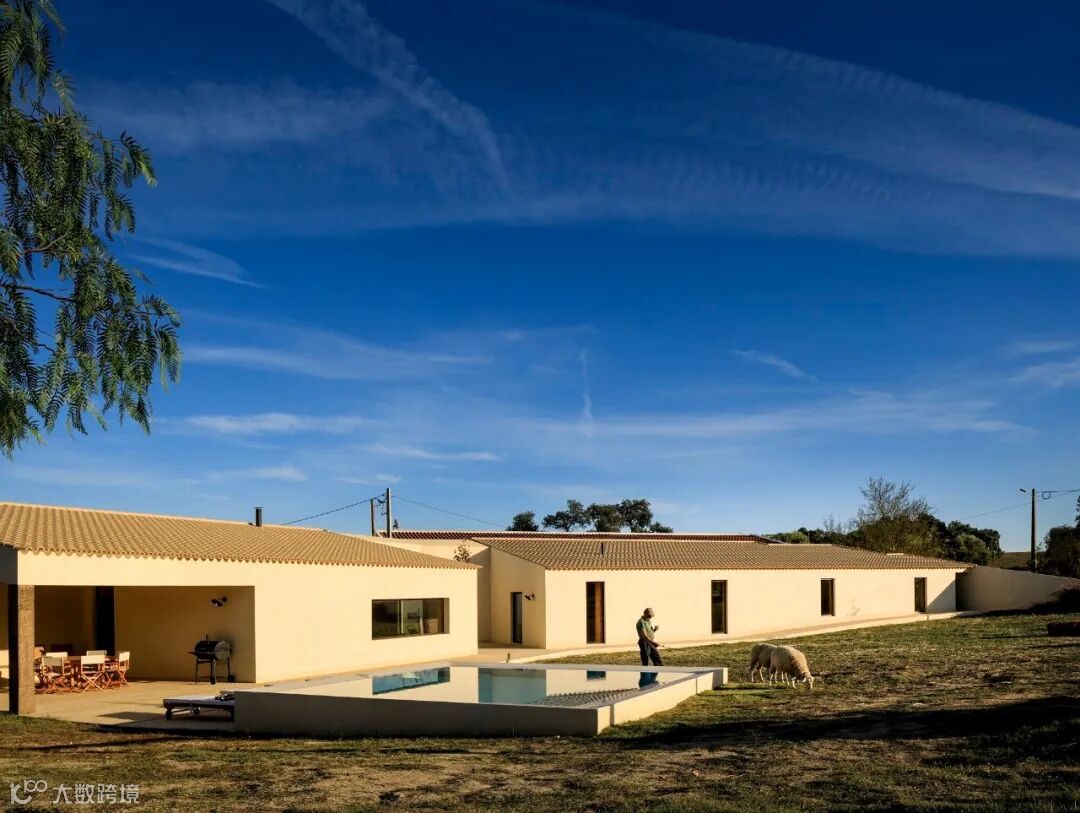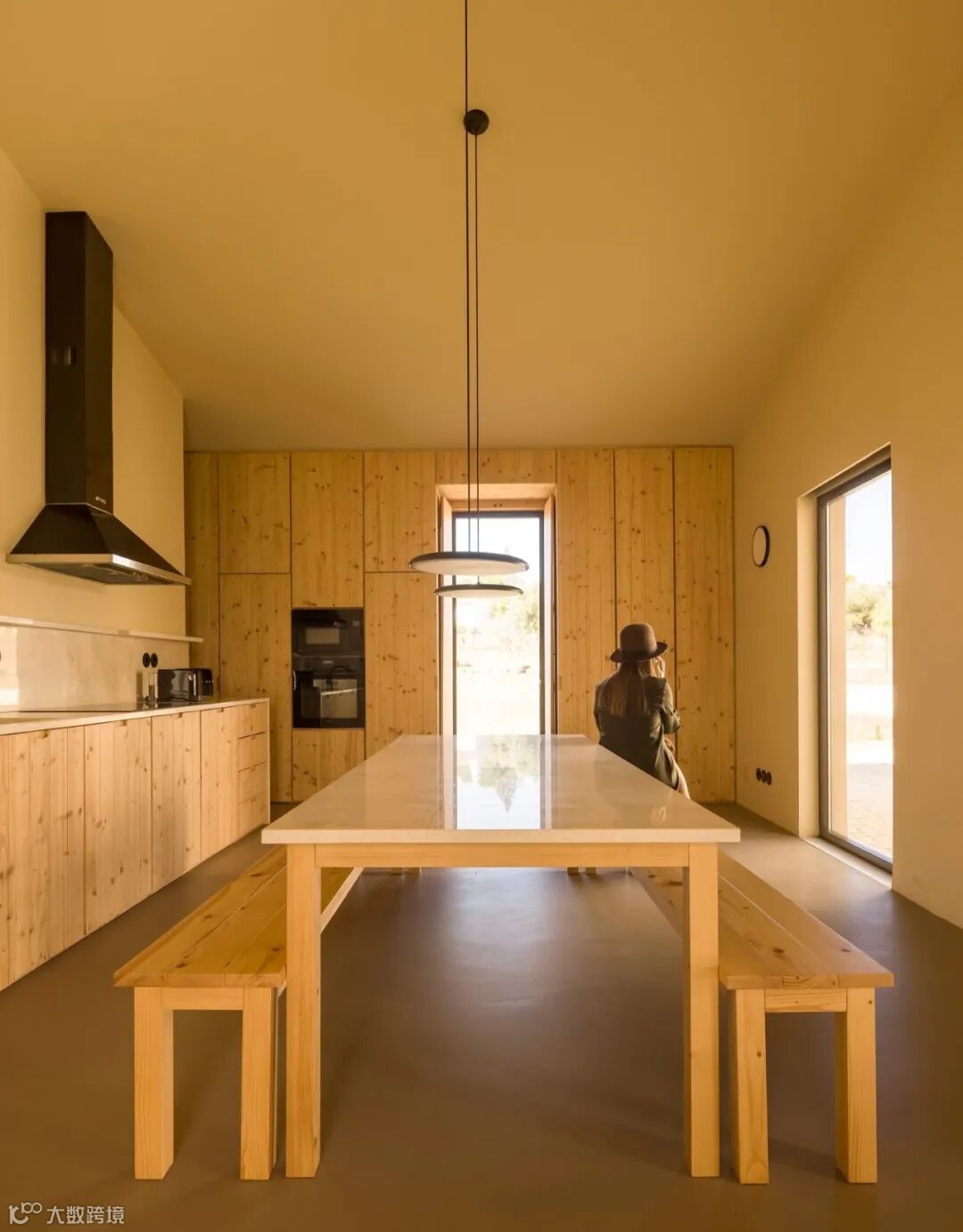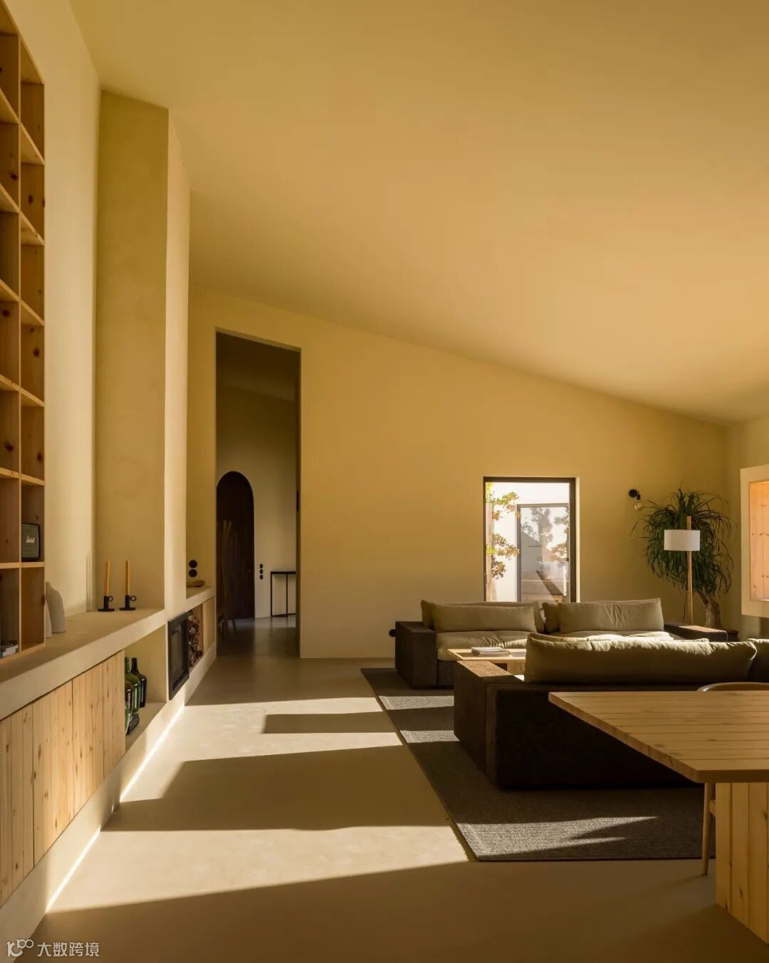 设计团队将起居室和餐厅等社交区域与卧室分离,通过一条紧靠边界的窄廊串联两个体块。土地的暖黄色被选做住宅的主基调,与传统的瓦片屋顶相辅相成,勾勒出自然且质朴的乡村生活。