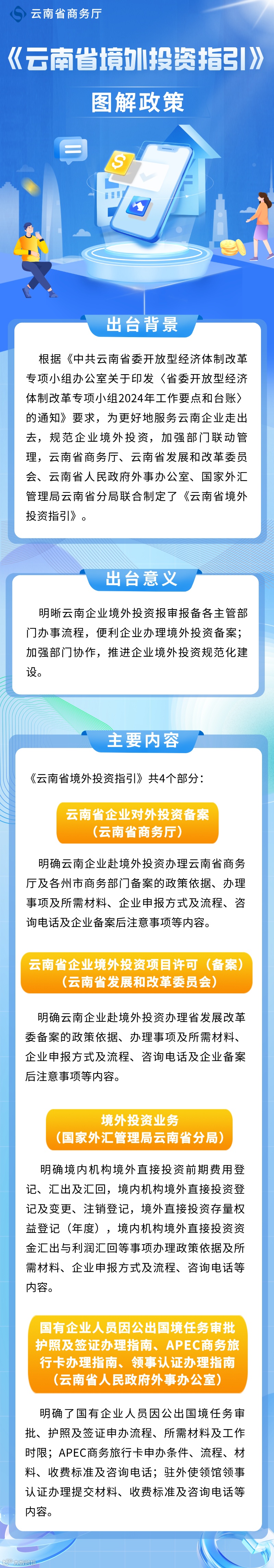 为更好地服务云南企业走出去,规范企业境外投资,加强部门联动管理,近日,云南省商务厅、云南省发展和改革委员会、云南省人民政府外事办公室、国家外汇管理局云南省分局联合制定了《云南省境外投资指引》。一起来看→