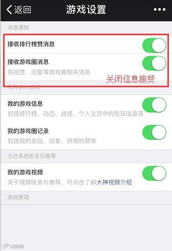 同样是进入微信后,依次点击 【发现】—【游戏】,下拉网页到底,点击页面底部的【游戏管理】图标—然后分别将「接收排行榜赞消息」以及「接收游戏圈消息」关闭即可。