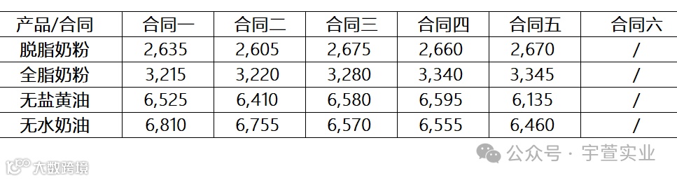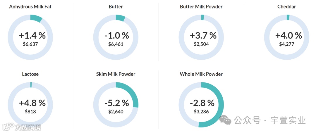 本次GDT拍卖脱脂乳粉价格下降5.2%,均价2,640美元/公吨;全脂乳粉价格下降2.8%,均价3,286美元/公吨;黄油价格下降1.0%,均价6,461美元/公吨;无水奶油上涨1.4%,均价6,637美元/公吨,具体拍卖结果如下: