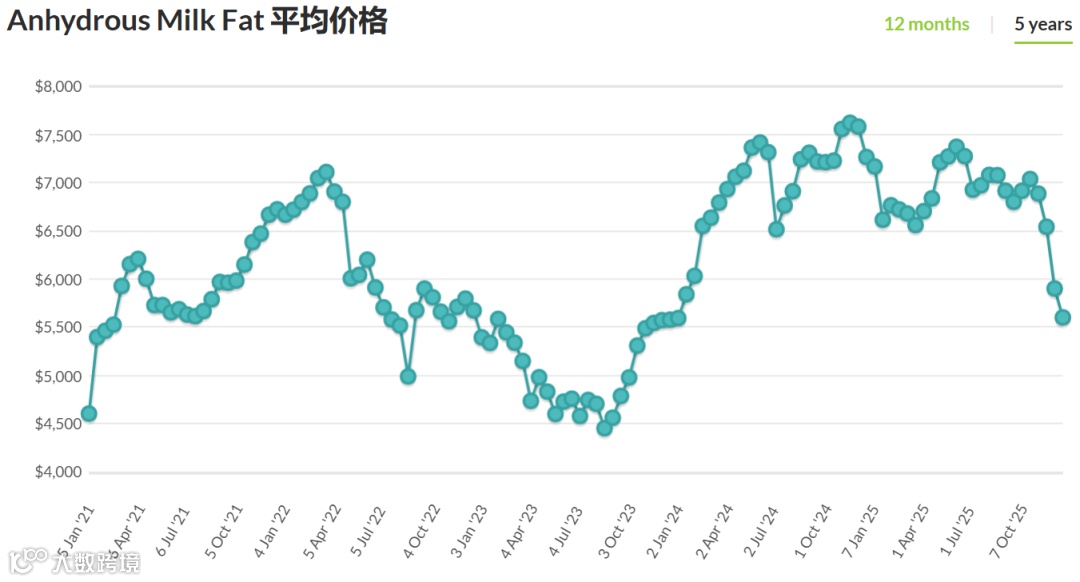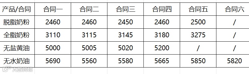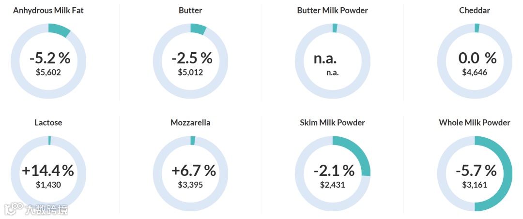导读:脱脂乳粉价格下跌2.1%,均价2,431美元/公吨;全脂乳粉价格下跌5.7%,均价3,161美元/公吨;黄油价格下跌2.4%,均价5,012美元/公吨;无水奶油下跌5.2%,均价5,602美元/公吨