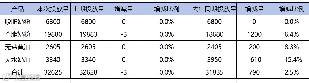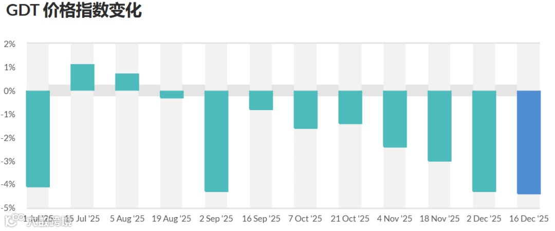 2025年12月16日GDT第394次拍卖,环比上期,各品种投放量持平。与去年同期比,各主要品种投放量略有变化,其中无水奶油减量15.4%,具体如下:
