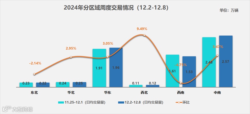 本周,全国二手车市场交易情况整体呈现回升趋势,但各区域市场表现呈现明显分化。华东与中南区域表现强劲,成为推动市场增长的主要力量;华北与西北地区市场亦持续回暖,展现出积极态势;而东北与西南地区则出现了一定程度的下滑。