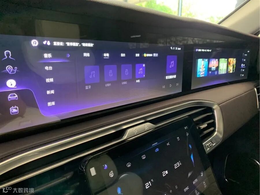 贯穿中控台的三块横向大屏完全满足了科技控的需求,加上中控下方的屏幕形成了一个“T”字形的屏幕矩阵,在中控上你几乎找不到任何物理按键,整体都在凸显简约而充满科技的氛围。