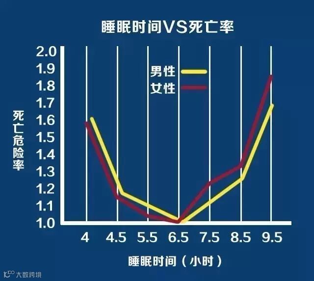 图表显示,睡眠时间在6.5~7.4小时之间,死亡率最低;少于4.4小时或高于8.5小时,死亡危险率会翻倍增高。