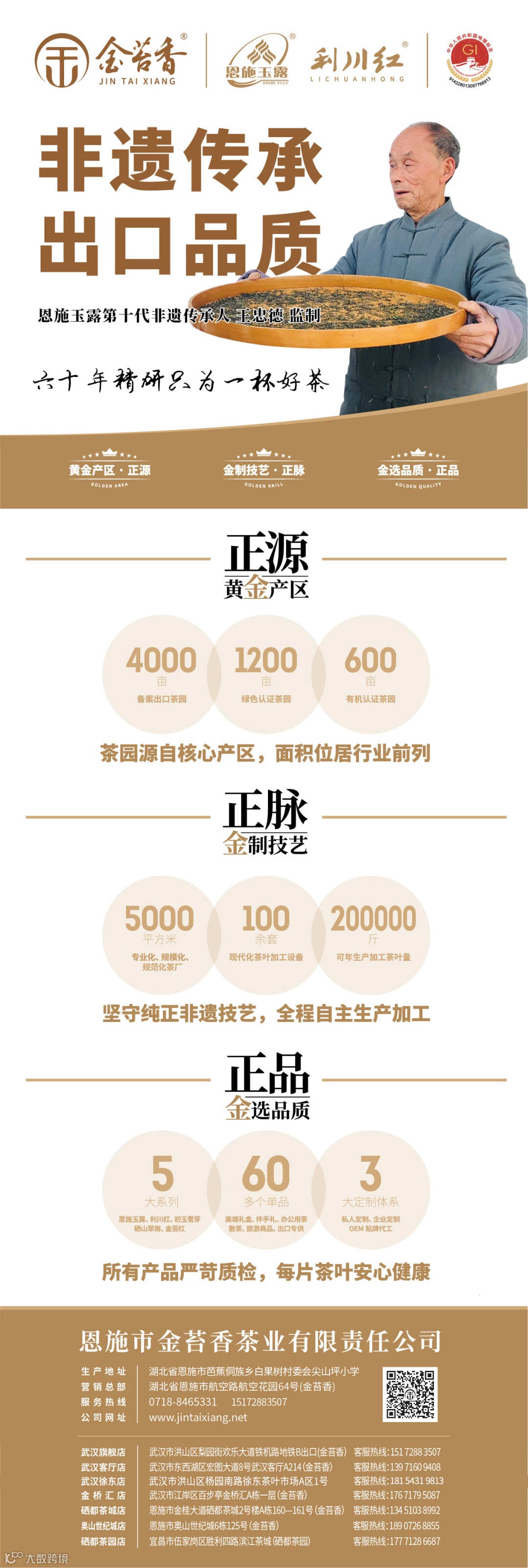 金苔香作为第一批恩施玉露备案出口及州级龙头企业,拥有4000亩备案出口茶园基地,5000平规范化生产基地。金苔香以生产基地为依托,形成“公司+基地+合作社+农户”的经营模式,从茶园到茶杯,让每一杯茶可溯源。
