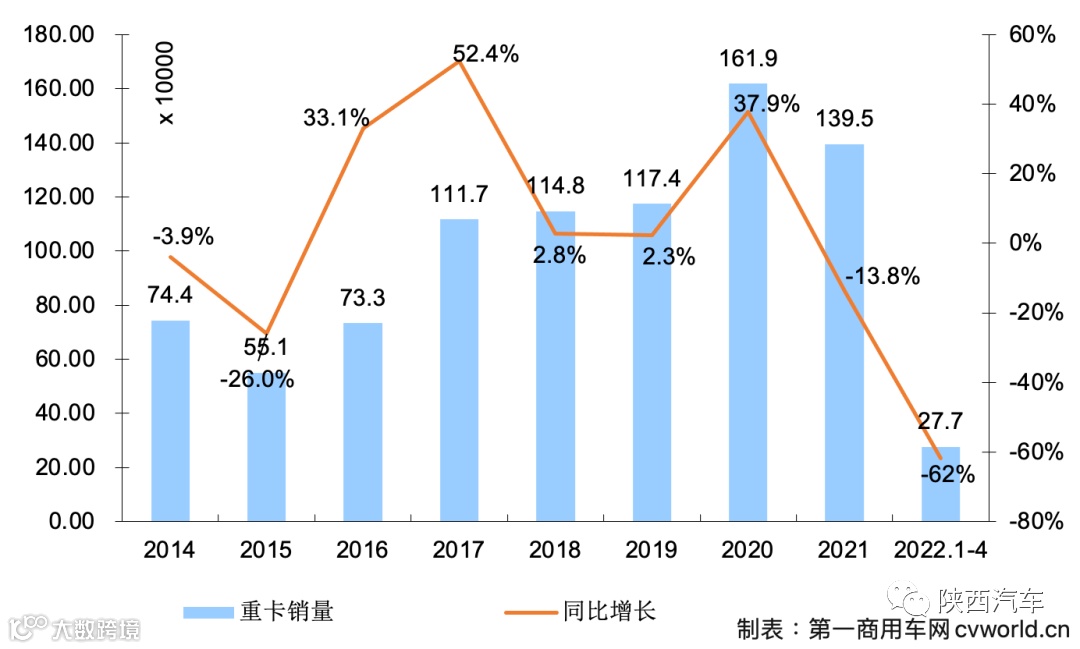 2014-2022年我国重卡市场销量年度走势图(单位:万辆)