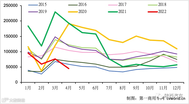 2015-2022年我国重卡市场销量月度走势图(单位:辆)