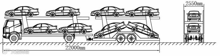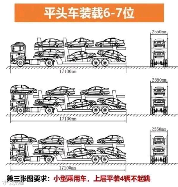中置轴车辆运输车装载8辆及以下,且装载长度、宽度未超过车辆运输车外廓尺寸限值的,暂不对超高进行处罚。若装载乘用车车型较小,上层单排平放5辆车(不得上下左右倾斜)前后均不超过车辆运输车外廓尺寸的,可允许装载9辆车,暂不对超高进行处罚。