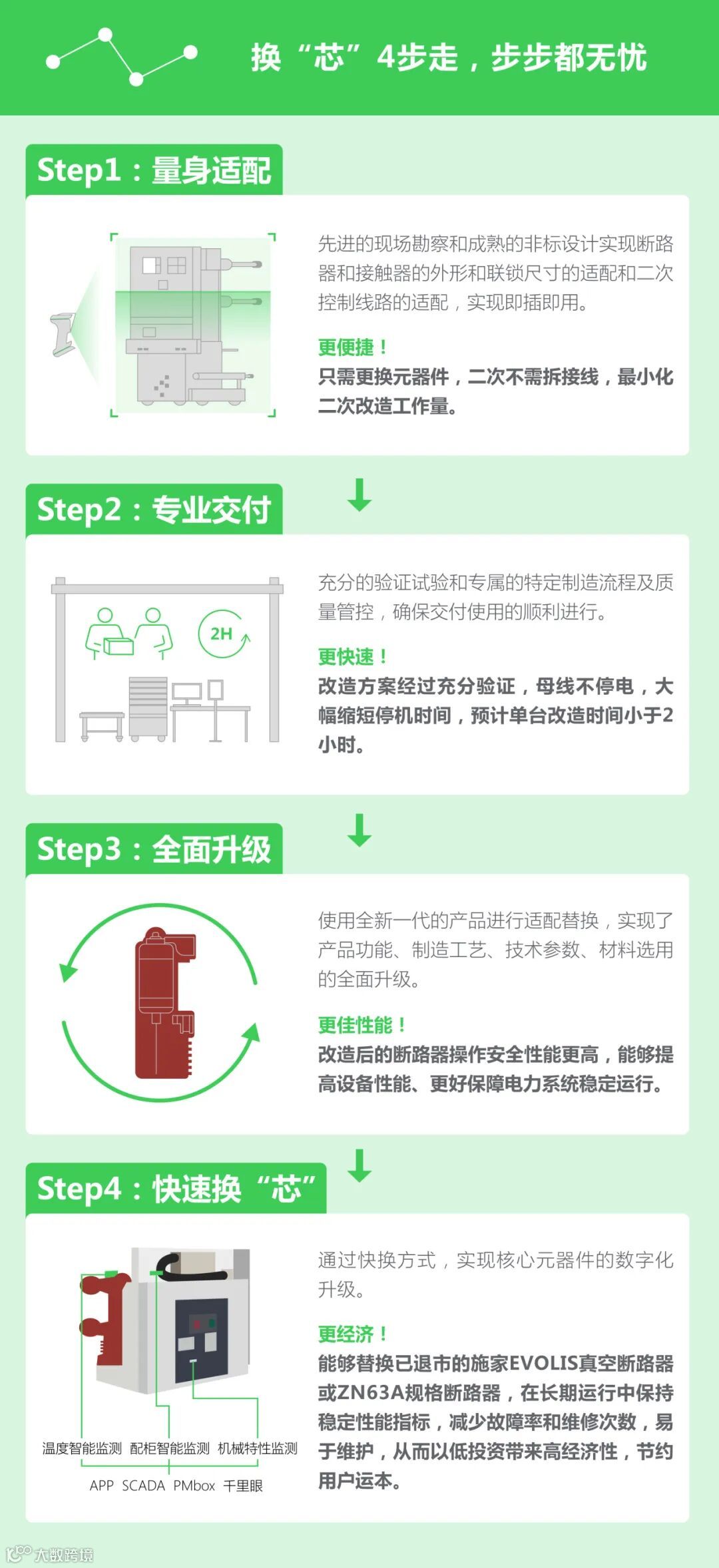 同时,面向中压设备改造需求,特此推出——配电适配改造服务!它能够与设备利旧评估一站式服务相结合,凭借换“芯”4步法,为老旧元器件实现局部高效换新,助力企业迈入高效配电设备改造的循环经济之路!