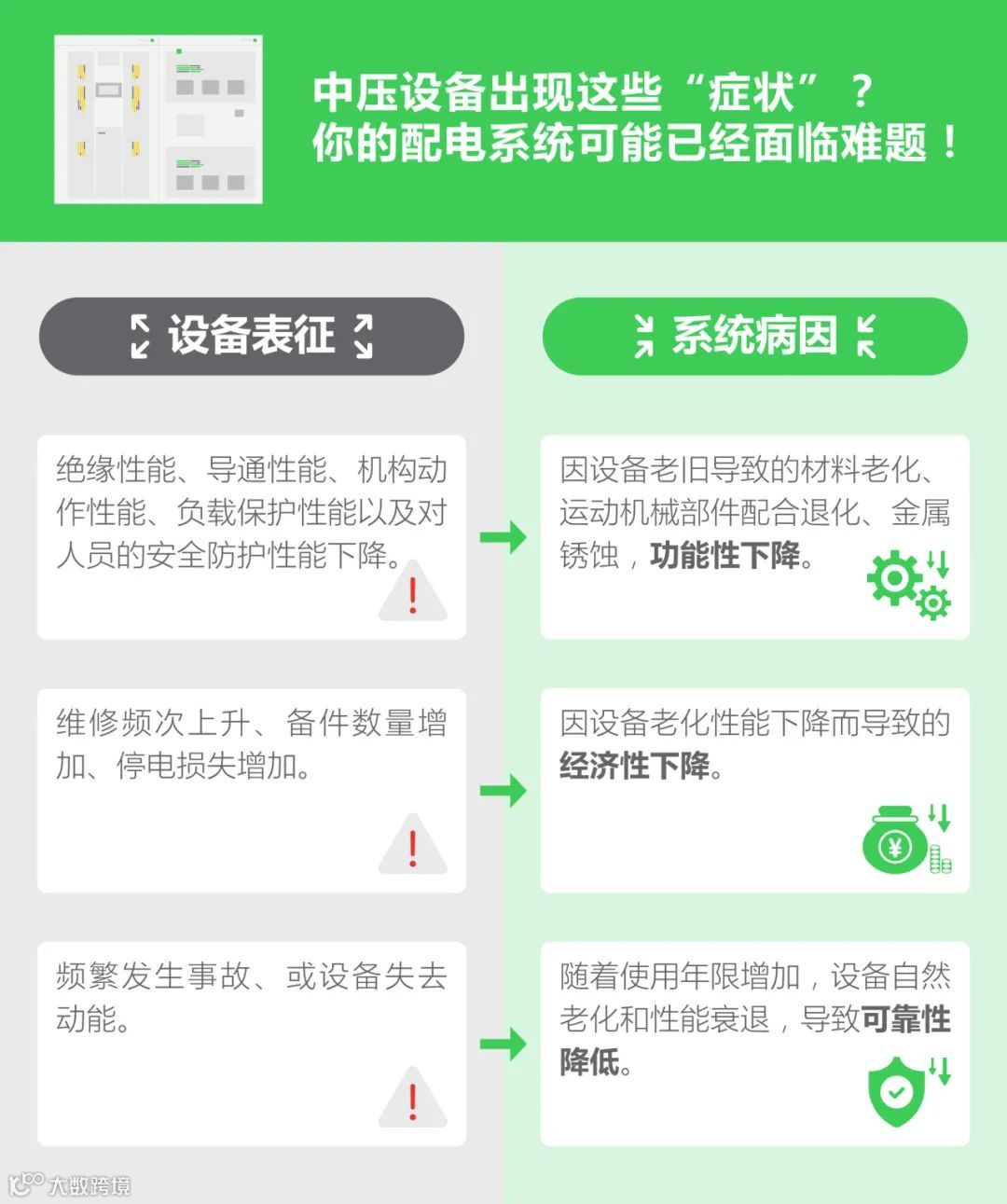 面对“屡发病症”的老旧设备,用户如何顺利查找病因?又应在哪些症状出现时进行改造?对此,我们特附一张「中压断路器故障表征溯源指南」,帮助老旧设备用户对症下药,“究病索因”。