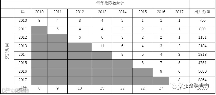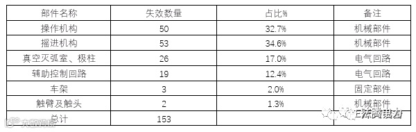 b.由于VGV断路器是在VS1基础上升级产品,因此分析VS1历史失效数据可以作为VGV断路器可靠性指标的参考。下表列出了VS1断路器2010~2017年的出厂数量和各年度的失效数量,以及失效部位及所占比例。