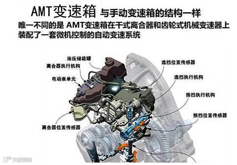 AMT的英文全称是Automated Mechanical Transmission。机械式自动变速箱。也可以看成自动的手动变速箱,是在通常的手动变速箱和离合器上配备一套电子控制的液压操纵系统,以达到自动切换档位目的的机构。AMT实际上是由一个机器人系统来完成操作离合器和选挡的两个动作,其核心技术是微机系统,电子技术及质量将直接决定AMT的性能与运行质量。