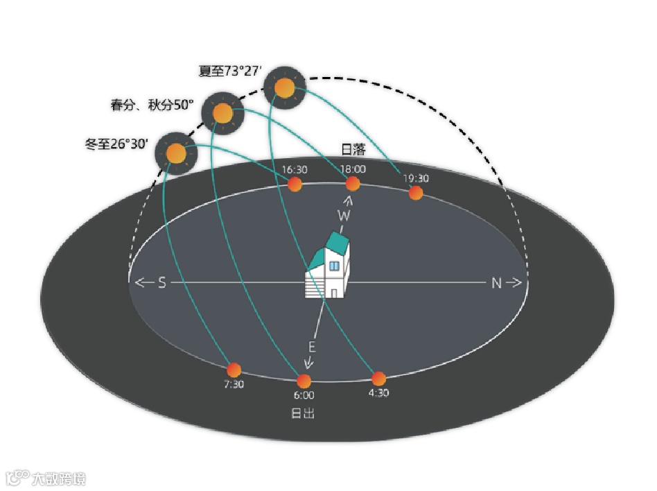 由上图可知,不管冬夏,太阳主要都在南面运动,所以我们住宅最好选择朝南。夏至太阳从东北出,西北落;冬至东南出,西南落,就是我们常说的的:太阳东升西落。