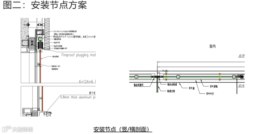例:南京某近零能耗项目,基于夏热冬冷的南京气候特点,结合项目本身特点(多层公建、内框架外幕墙结构),65%节能既有建筑改造成近零能耗建筑的客户需求,项目采用的外遮阳方案如下图二: