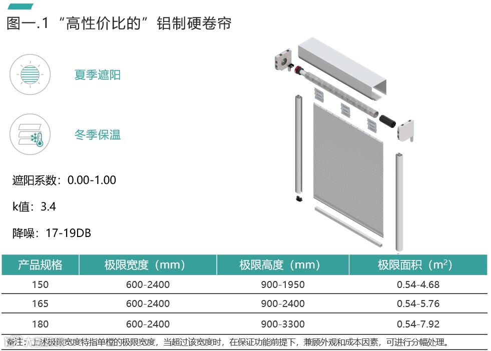 选择时需要注意活动式外遮阳产品的两大重要指标:隐性指标和显性指标。隐性指标包括:遮阳系数、抗风性能、机械耐久性等;显性指标包括:可以应用的洞口尺寸所对应的箱体及导轨尺寸,尤其是箱体的尺寸,它是影响外立面的基础因素。市场主流的外遮阳产品功能及应用洞口尺寸如下图一: