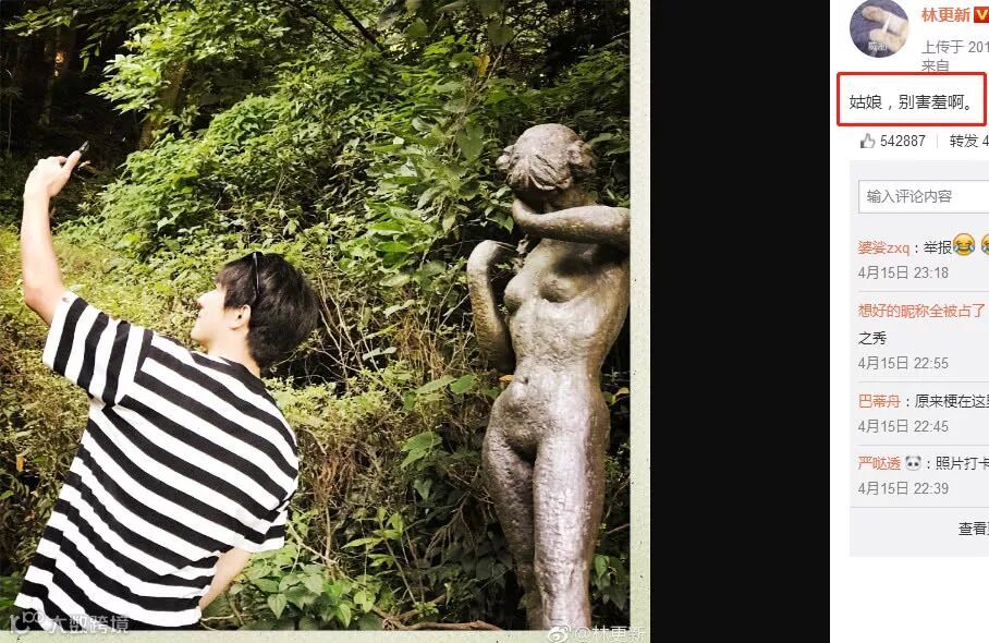 林更新与石像合影秀恩爱也真是另类,“九亿少女梦”的秀恩爱方式果然不一样