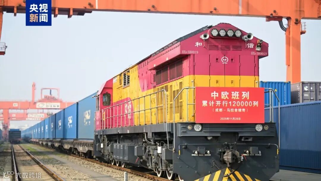 记者从中国国家铁路集团有限公司获悉,2025年11月28日12时13分,随着开往波兰马拉舍维奇的X8086次中欧班列从中国成都国际铁路港发车,中欧班列累计开行突破12万列,发送货值超4900亿美元。中欧班列高质量发展取得新成效,品牌价值得到全球认可。