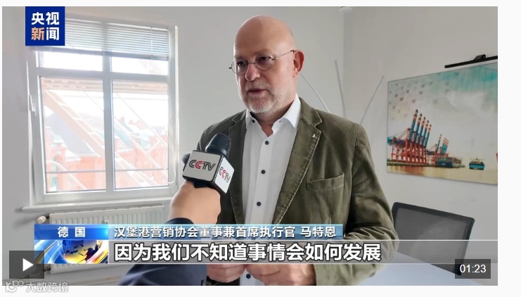 汉堡港是德国最大的港口,也是欧洲重要的港口。汉堡港营销协会董事兼首席执行官马特恩在接受总台记者采访时表示,近期美国关税政策反复无常带来更多不确定性,令人无法对供应链作出重要决策,给港口的运营带来负面影响。