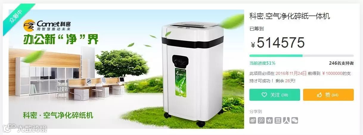 10月25日,在京东众筹平台,由阳光科密发起的“科密.空气净化碎纸一体机”众筹活动拉开帷幕(网址 http://z.jd.com/project/preview/66935.html),获得广泛关注,并吸引数百位网友参与支持,上线仅第二天,便完成进度50%以上,破50万的众筹额,活动非常火爆!