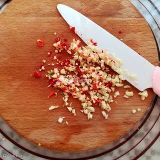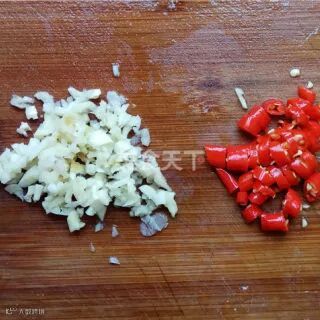 6、蒜米和辣椒用奈瓷的切菜刀切碎。