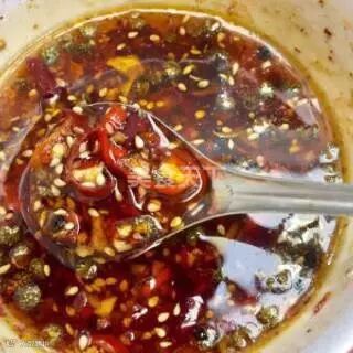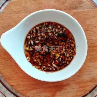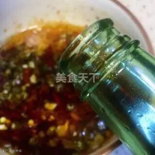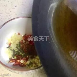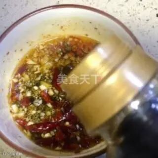 7、把蒜米和辣椒放入小碗里,加入盐,生抽,香醋,香油。
