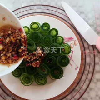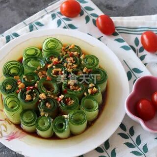 5、所有的黄瓜皮依次卷好靠紧放入盘子里。