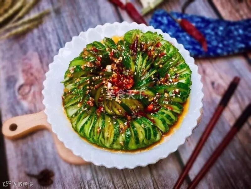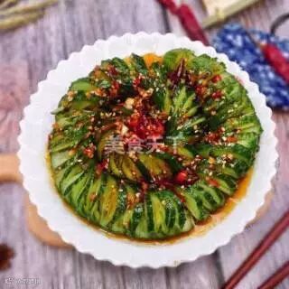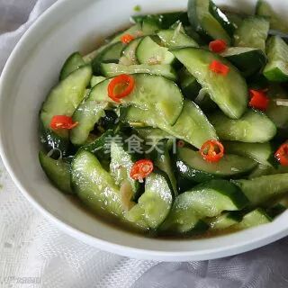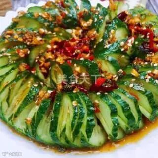 黄瓜2根、蒜米4瓣、辣椒7个、盐1克、生抽10克、香醋5克、香油5克、橄榄油20克。