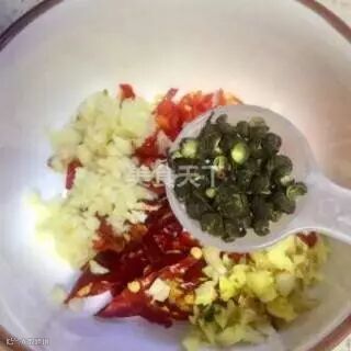 3、把两种辣椒任意切碎,老姜大蒜剁末装在一个碗里,放入30左右的青花椒粒。