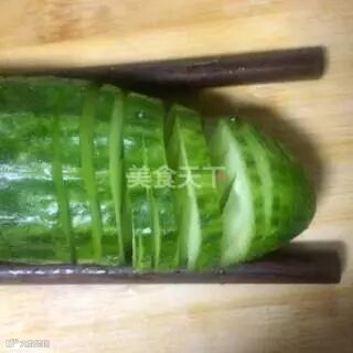 1、切的时候一定注意筷子要垫在黄瓜两边做为落刀的标准,这样不会被切断。