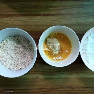 8、鸡蛋打散在碗里, 把鸡翅分别放淀粉、鸡蛋、燕麦里裹一下。