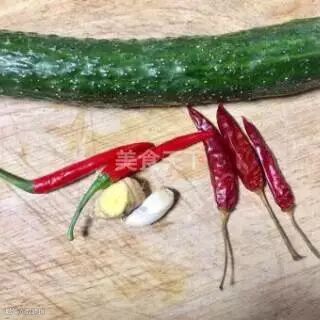 黄瓜一根、红尖椒两个、干辣椒三个、青花椒30粒、生抽两勺许、醋半勺、大蒜两瓣、盐少许。