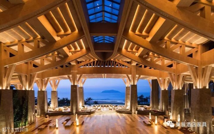 大堂采用三角斜顶的设计,现代的装潢风格与古式建筑理念的完美融合。大堂直面海景,海中有岛,岛中有山,山中有韵,步入大堂便让人即时领略自然之趣。