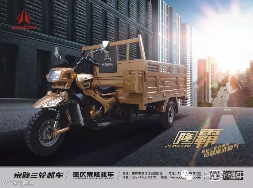 宗隆隆霸:重载三轮的典范,尽显威武霸气,采用市场定制版黄金双冷王270发动机(最高时速≥150Km/h,最大坡度≥61°),汽车动平衡技术(60 Km/h脱把行驶一条直线),自主研发“宗隆造”前减震(过减速带如履平地),轻松上楼,超强舒适;独具个性的子弹头壳(仿生鸟喙造型设计,有效导流减低风阻),“驰聘天下,唯我隆霸”。