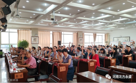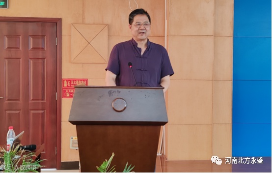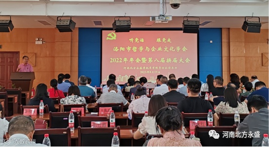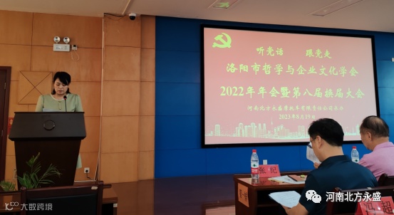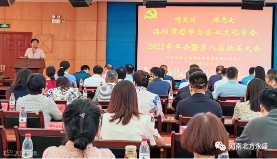 北方永盛公司党委书记、董事长高留斌致词,说到:洛阳市哲学与企业文化学会2022年年会暨第八届换届大会选址在北方永盛公司召开,这是对公司最大的信任和支持,也是对公司发展、党建工作和德孝文化的充分肯定。首先,代表公司及全体员工,对参加会议的各位领导、专家和同仁们表示诚挚欢迎!然后,向专家们简要介绍了公司的发展历程、企业文化及党建工作。公司成立28年来,始终以“党建引领,德孝立企,产业报国”为宗旨,听党话,感党恩,跟党走,多年来的品质保证与精益服务,为产品赢得了“北方永盛,结实耐用”的良好口碑。北方永盛公司自成立之初,就主动积极申请在公司建立基层党支部委员会。在各级党委的指导帮助下,2000年11月,北方永盛公司党支部委员会建立,成为洛阳市第一批建立基层党组织的民营企业之一。随着党员队伍的壮大,2006年6月公司成立党总支。2018年5月,在上级党组织关心下成立了洛龙区非公企业党委,下辖三个支部:机关党支部、销售党支部、生产党支部。按照党的组织原则和发展党员制度要求,有计划地发展党员,自2000年以来,先后发展党员86人,为党的组织建设和企业发展奠定了坚实基础。2018年6月公司被河南省工商行政管理局授予河南省工商系统非公党建工作示范基地。2021年6月,在庆祝建党100周年之际,公司党委被洛阳市委授予洛阳市先进基层党组织。在企业发展的同时,十分重视党建工作,企业内部“围绕生产抓党建,抓好党建促生产”氛围十分浓厚。党建在企业发展的各个阶段发挥着十分重要的引领作用,引领着企业从小到大,由弱到强,营造了党建工作和生产经营的双赢局面。