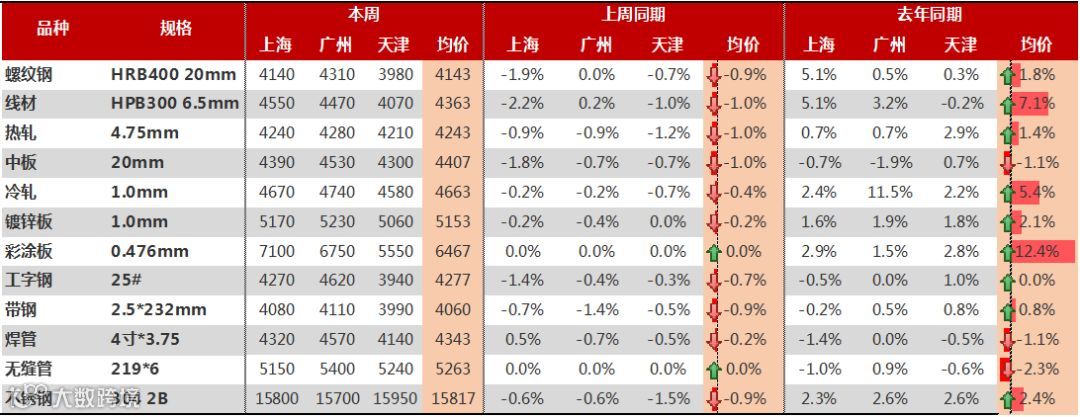 分区域而言,上海钢材市场整体表现较弱,尤其是螺纹钢、线材、中板和工字钢。天津市场热轧、冷轧和不锈钢市场表现相对较弱。